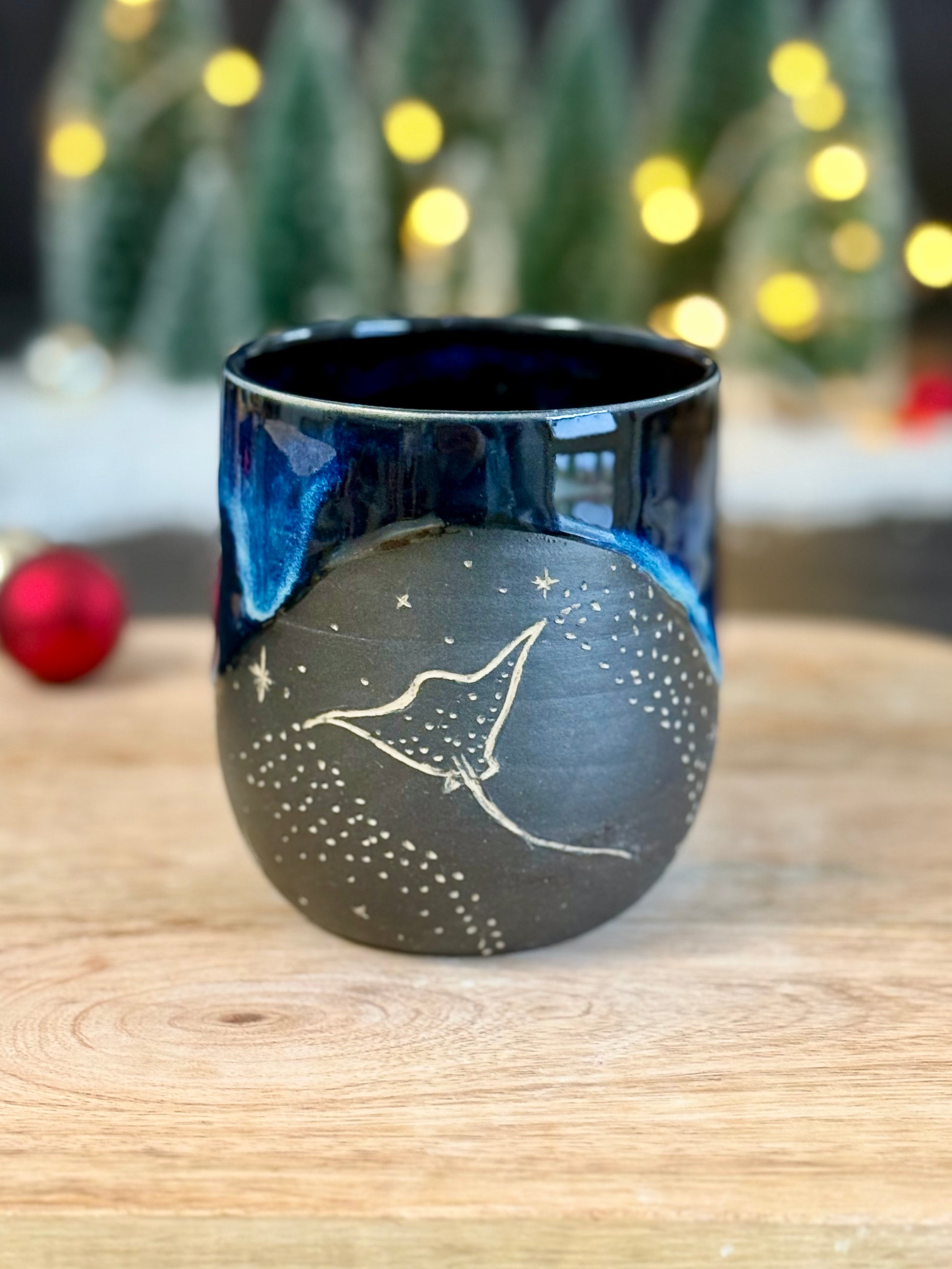 Handgemachter Becher in der Glasur "Galaxy". Der Rochen und die Sterne sind in der Sgraffito Technik entstanden und wurden in den noch nicht gebrannten Ton geschnitzt.