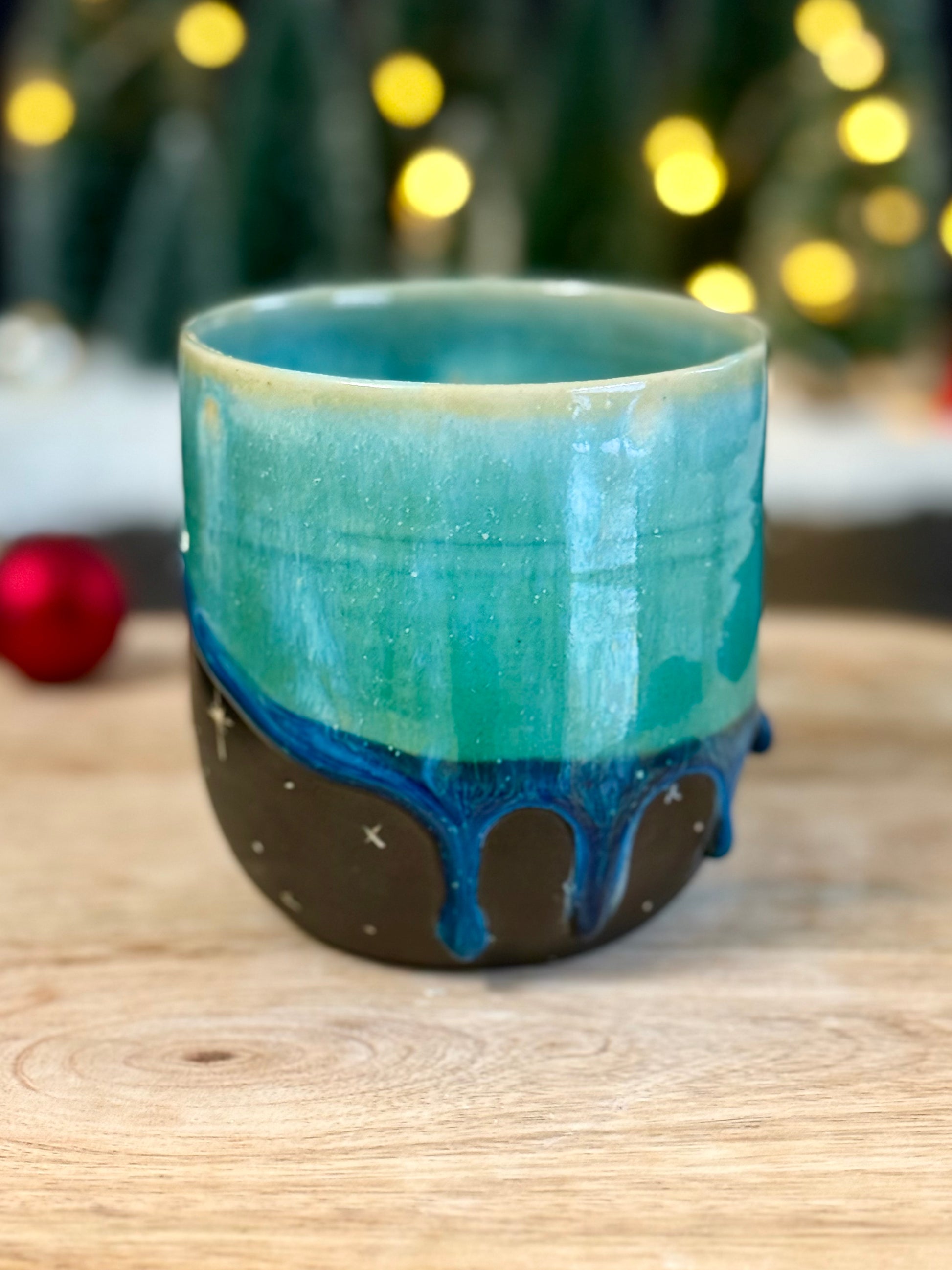 Handgemachter Becher in der Glasur "Lagoon". Der Rochen und die Sterne sind in der Sgraffito Technik entstanden und wurden in den noch nicht gebrannten Ton geschnitzt.