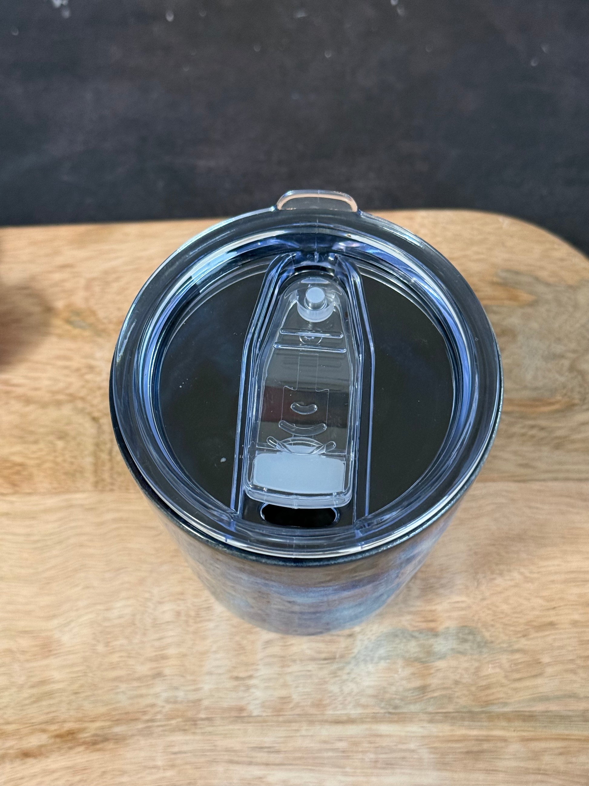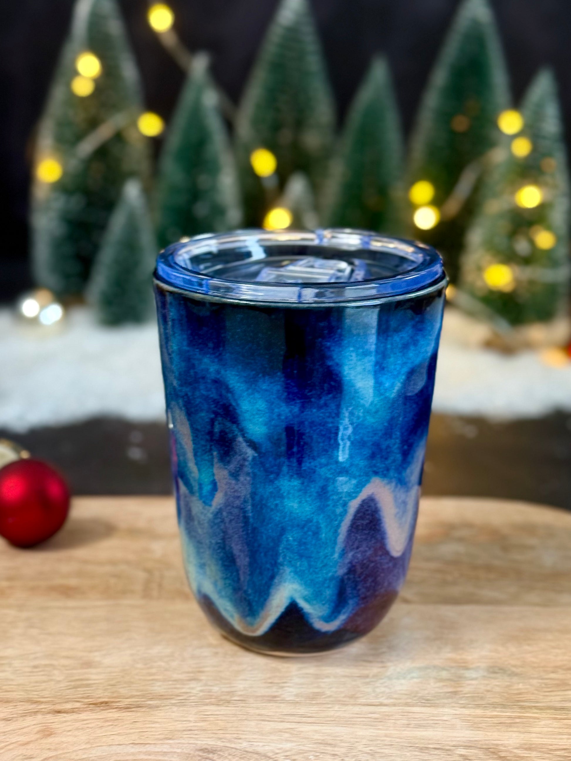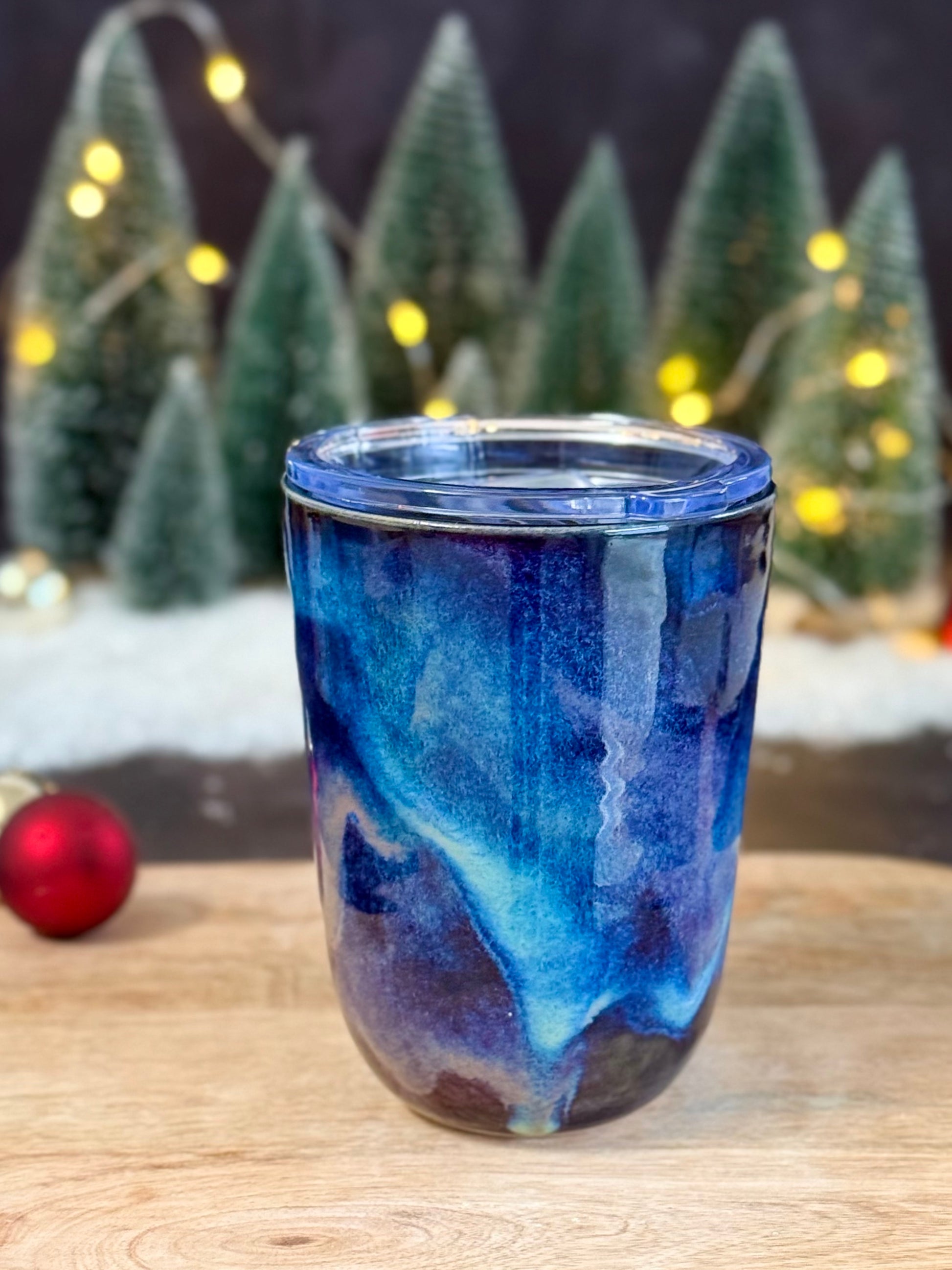 Becher in Galaxy Glasur mit ToGo Deckel aus Kunststoff mit Dichtungsgummi.