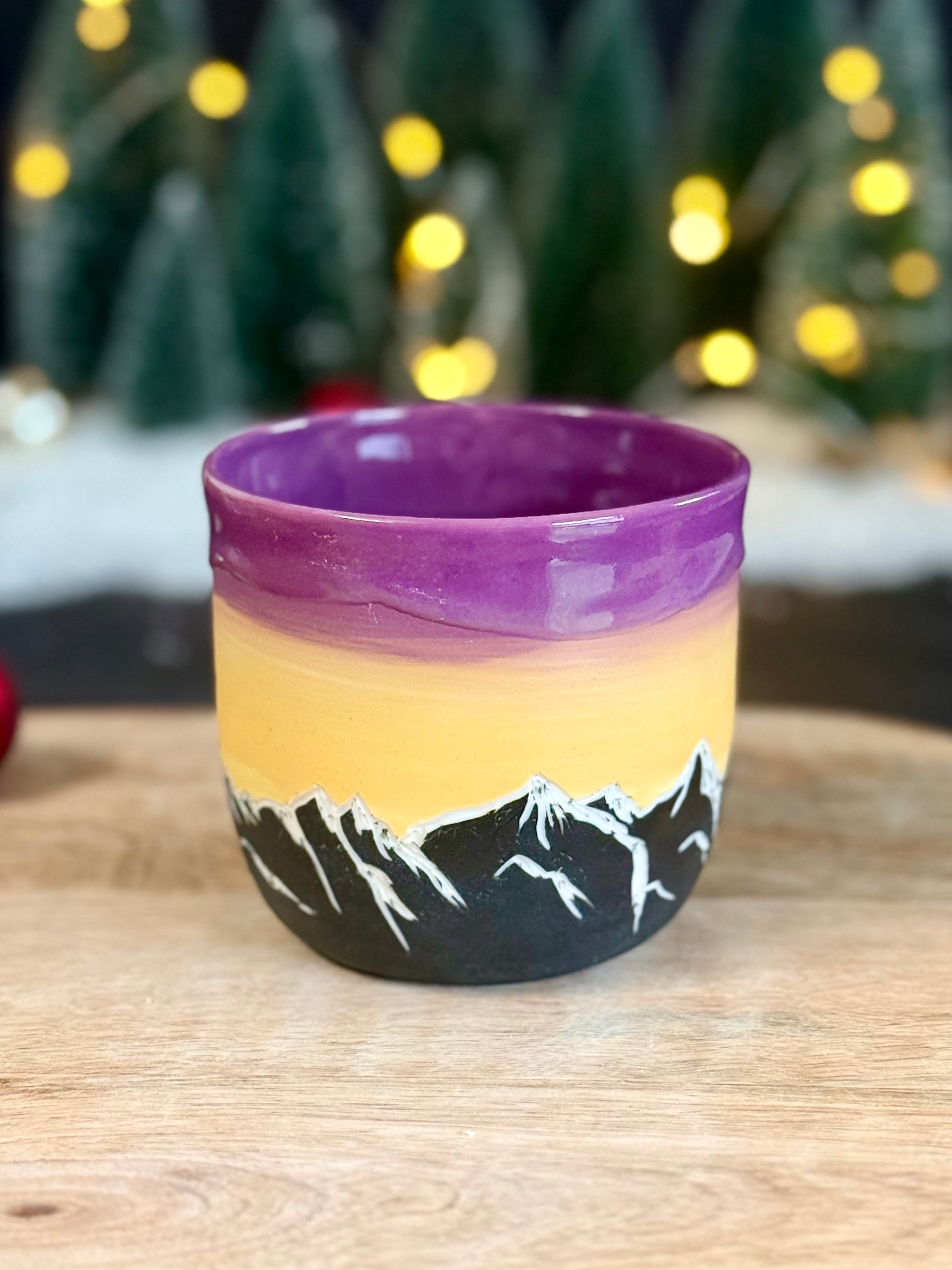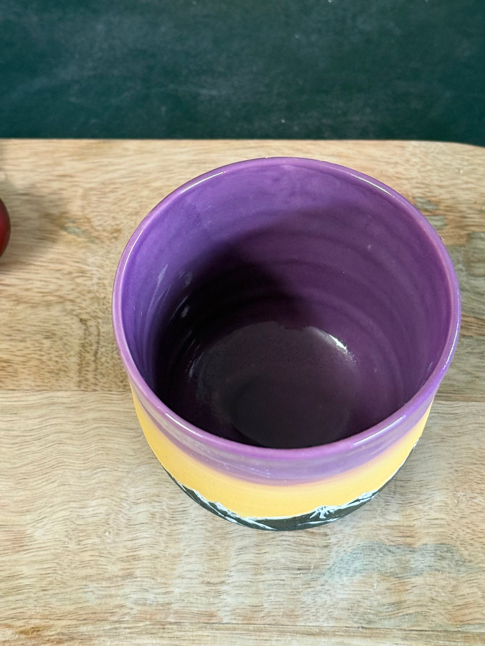Becher aus edlem Porzellan in "Dawn", die Berge wurden in der Sgraffitto Technik geschnitzt, Farbverlauf Lila Gelb