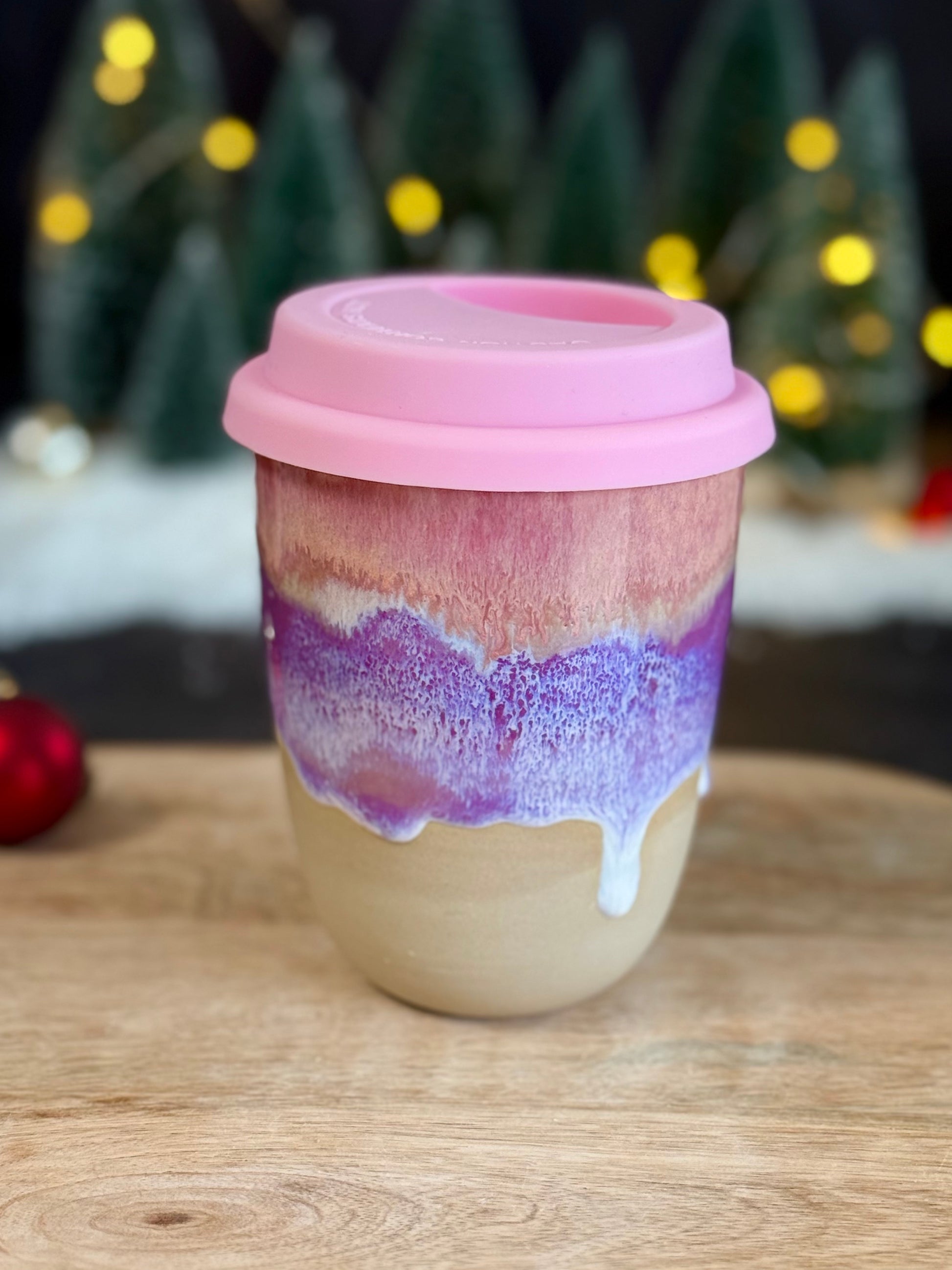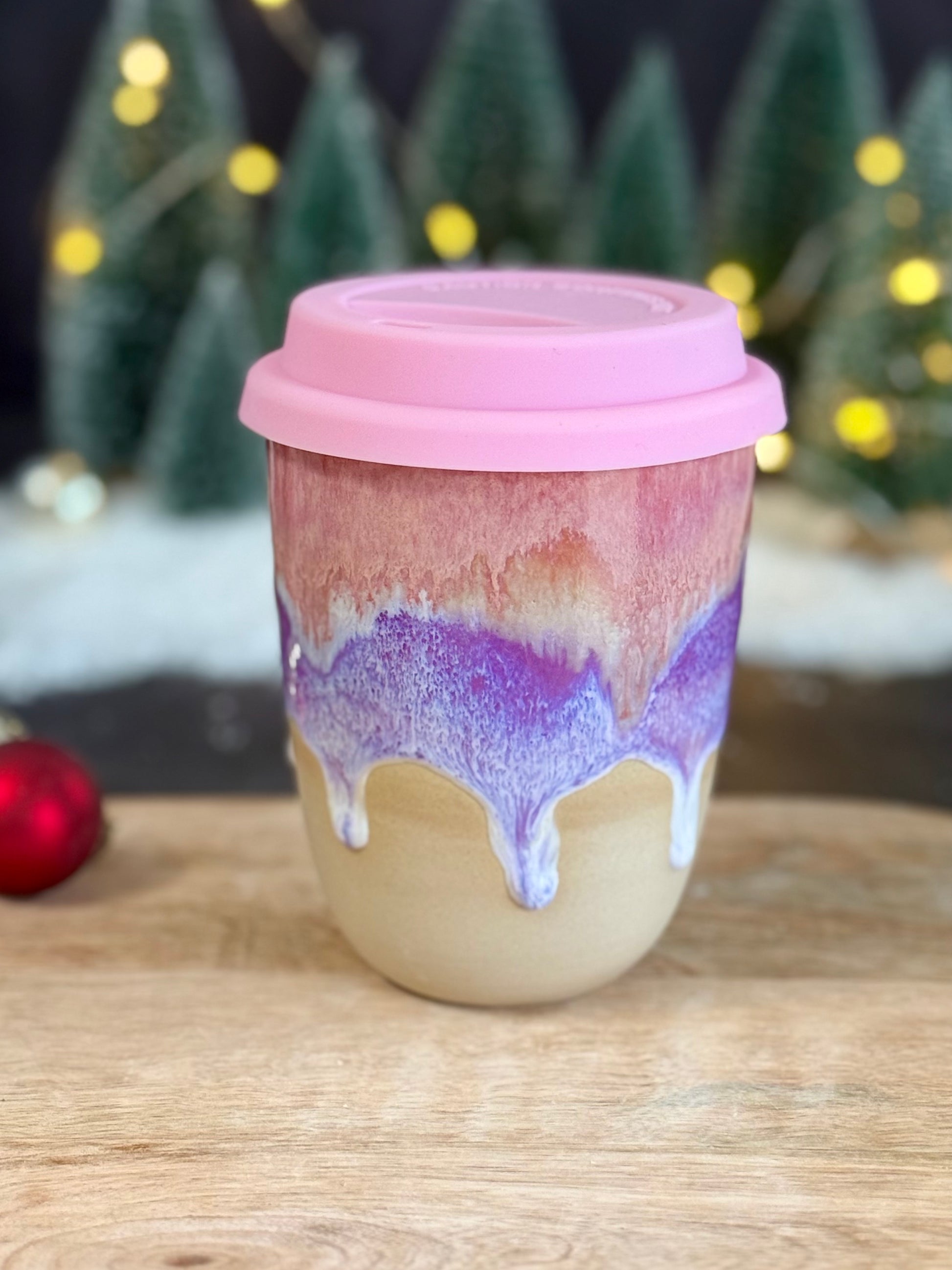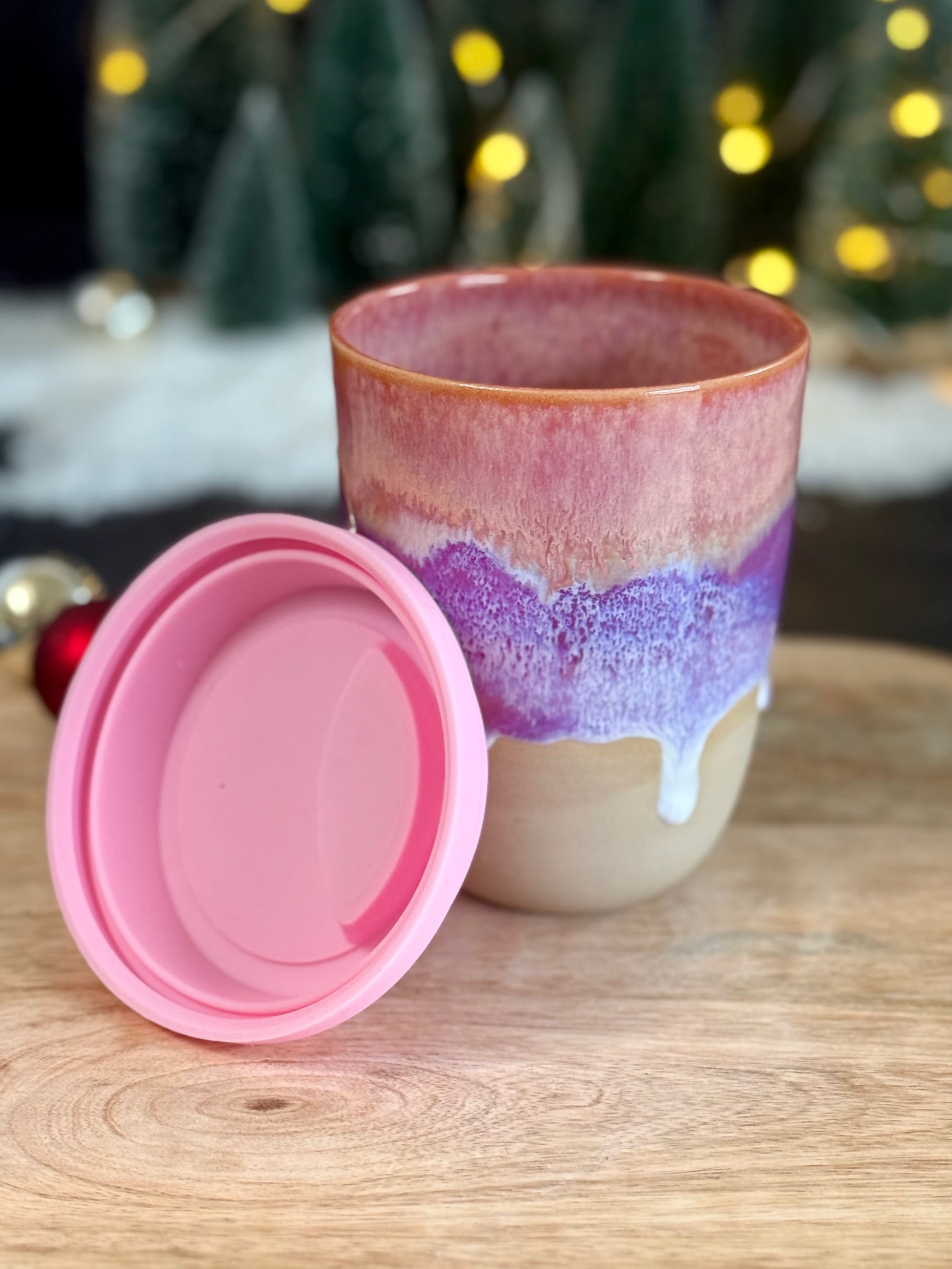 Lattebecher in der Glasur "Sunset Waves". Mit Silikondeckel, kann man auch nachkaufen.